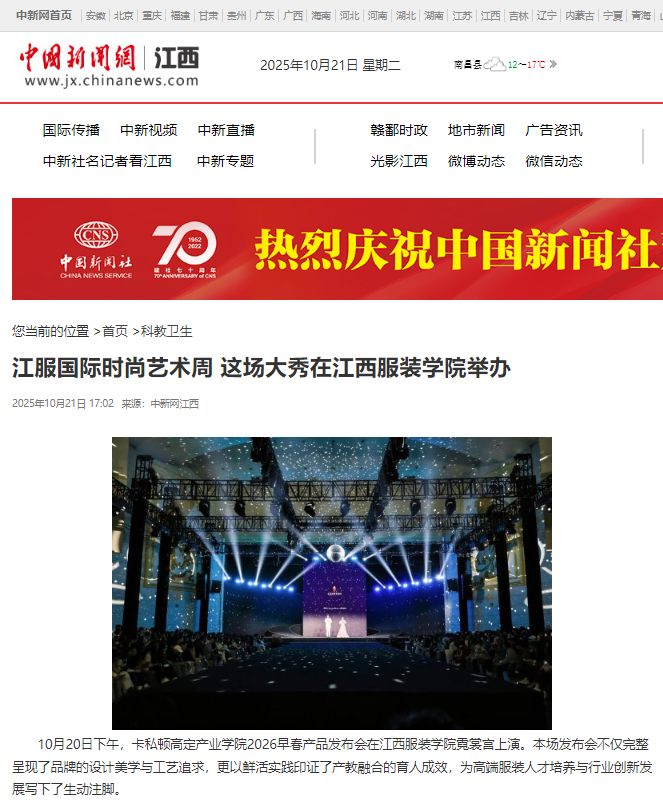 10月20日下午,卡私顿高定产业学院2026早春产品发布会在江西服装学院霓裳宫上演。本场发布会不仅完整呈现了品牌的设计美学与工艺追求,更以鲜活实践印证了产教融合的育人成效,为高端服装人才培养与行业创新发展写下了生动注脚。