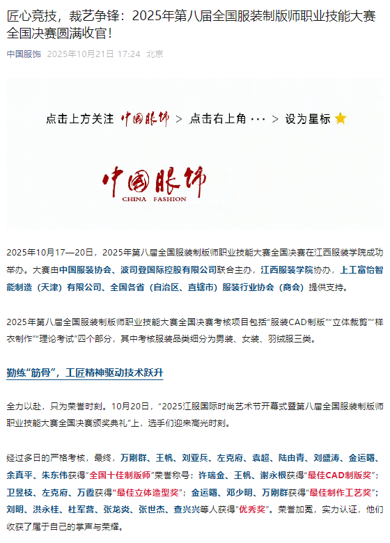 2025年10月17—20日,2025年第八届全国服装制版师职业技能大赛全国决赛在江西服装学院成功举办。大赛由中国服装协会、波司登国际控股有限公司联合主办,江西服装学院协办,上工富怡智能制造(天津)有限公司、全国各省(自治区、直辖市)服装行业协会(商会)提供支持。2025年第八届全国服装制版师职业技能大赛全国决赛考核项目包括“服装CAD制版”“立体裁剪”“样衣制作”“理论考试”四个部分,其中考核服装品类细分为男装、女装、羽绒服三类。