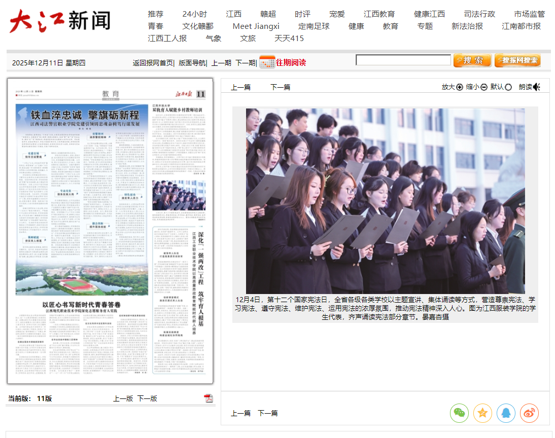 《江西日报》(2025年12月11日 第11版)刊登报道:12月4日,第十二个国家宪法日,江西服装学院以主题宣讲、集体诵读等方式,营造尊崇宪法、学习宪法、遵守宪法、维护宪法、运用宪法的浓厚氛围,推动宪法精神深入人心。