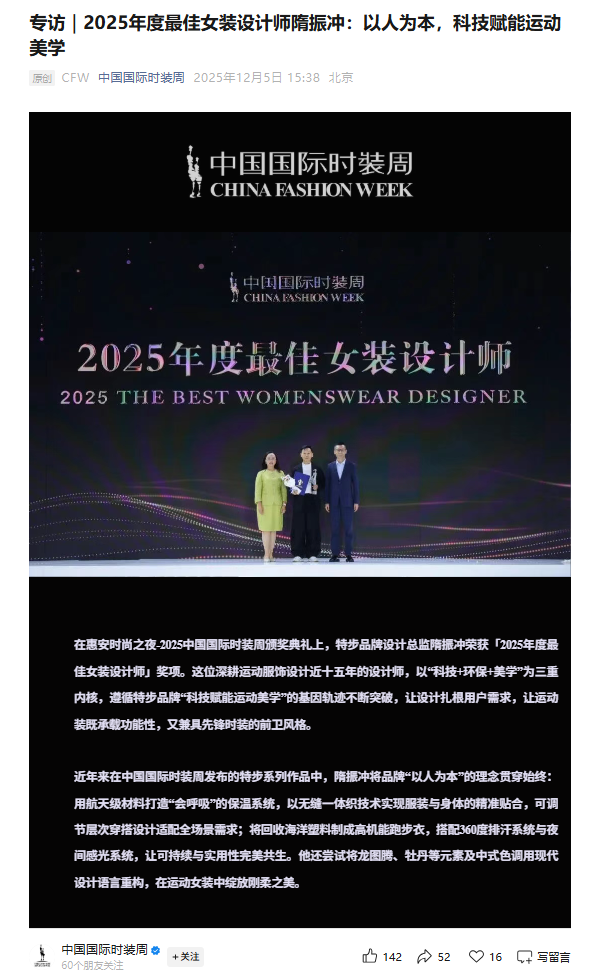 在惠安时尚之夜-2025中国国际时装周颁奖典礼上,特步品牌设计总监隋振冲荣获「2025年度最佳女装设计师」奖项。这位深耕运动服饰设计近十五年的设计师,以“科技+环保+美学”为三重内核,遵循特步品牌“科技赋能运动美学”的基因轨迹不断突破,让设计扎根用户需求,让运动装既承载功能性,又兼具先锋时装的前卫风格。