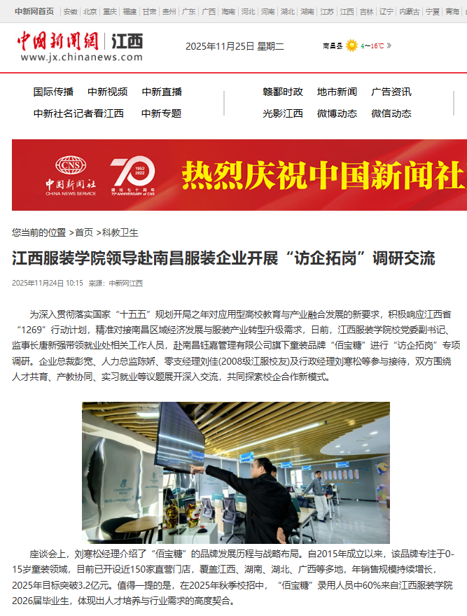 为深入贯彻落实国家“十五五”规划开局之年对应用型高校教育与产业融合发展的新要求,积极响应江西省“1269”行动计划,精准对接南昌区域经济发展与服装产业转型升级需求,日前,江西服装学院校党委副书记、监事长唐新强带领就业处相关工作人员,赴南昌钰嘉管理有限公司旗下童装品牌“佰宝糖”进行“访企拓岗”专项调研。企业总裁彭宽、人力总监陈娇、零支经理刘佳(2008级江服校友)及行政经理刘寒松等参与接待,双方围绕人才共育、产教协同、实习就业等议题展开深入交流,共同探索校企合作新模式。