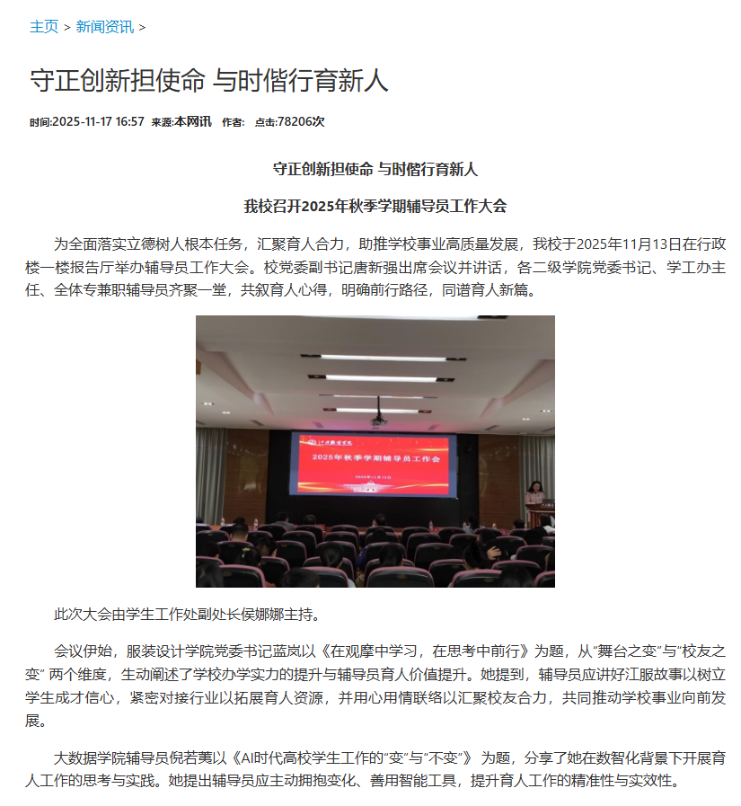 为全面落实立德树人根本任务,汇聚育人合力,助推学校事业高质量发展,我校于2025年11月13日在行政楼一楼报告厅举办辅导员工作大会。校党委副书记唐新强出席会议并讲话,各二级学院党委书记、学工办主任、全体专兼职辅导员齐聚一堂,共叙育人心得,明确前行路径,同谱育人新篇。