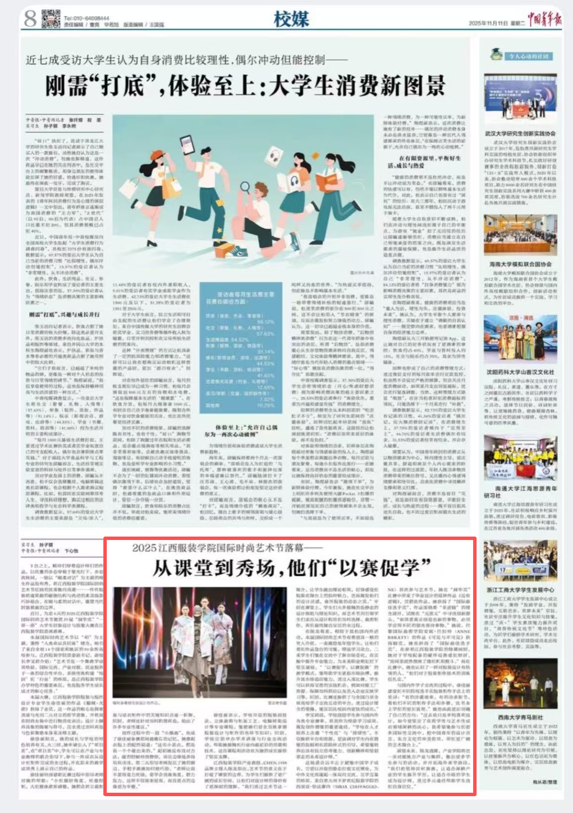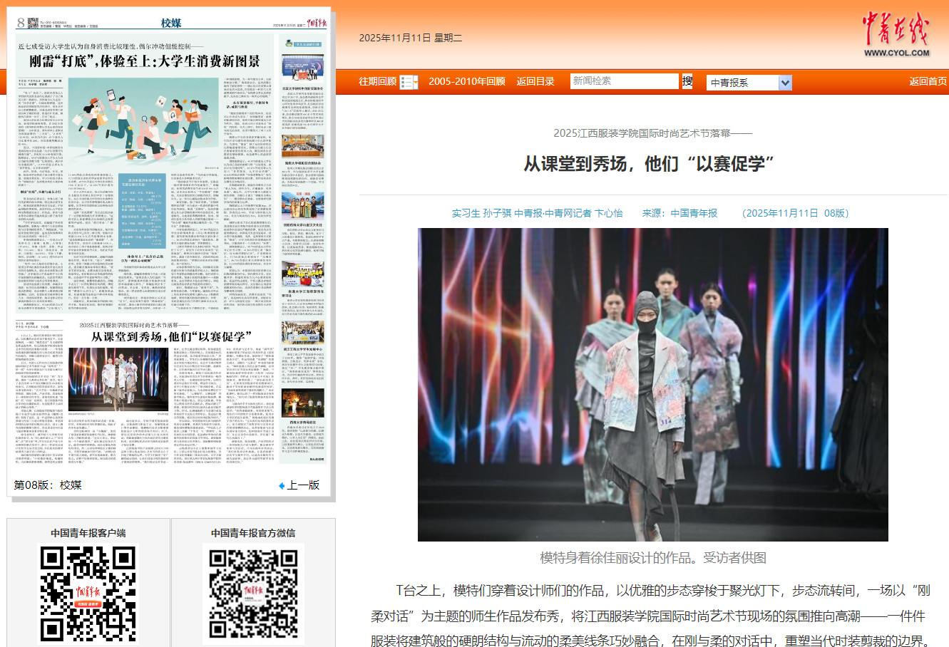 《中国青年报》(2025年11月11日 第08版)刊登报道:T台之上,模特们穿着设计师们的作品,以优雅的步态穿梭于聚光灯下,步态流转间,一场以“刚柔对话”为主题的师生作品发布秀,将江西服装学院国际时尚艺术节现场的氛围推向高潮——一件件服装将建筑般的硬朗结构与流动的柔美线条巧妙融合,在刚与柔的对话中,重塑当代时装剪裁的边界。近日,为期6天的2025江西服装学院国际时尚艺术节暨第29届“润华奖”“一带一路”大学生时装设计与技能大赛在江西服装学院圆满落幕。本届国际时尚艺术节以“和”为主题,秉持“人类命运共同体”理念,吸引了来自全球14个国家和地区的90余所高校参与。